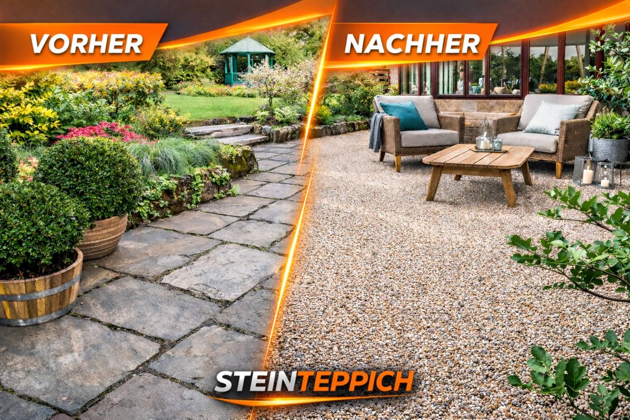 Ein Vorher-Nachher-Vergleich zeigt besonders deutlich, wie stark sich eine Fläche durch Steinteppich optisch verändern kann.